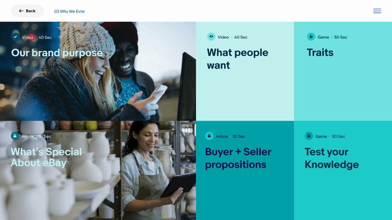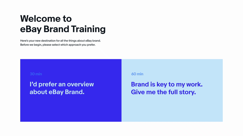 The training was built in a modular way, allowing for multiple audiences with varying degrees knowledge requirements, as well as easy and ongoing content updates to map the brand’s evolution. Every new hire would go through this training as a way to ground themselves in basic brand knowledge, as well as understanding the eBay brand in-depth.
